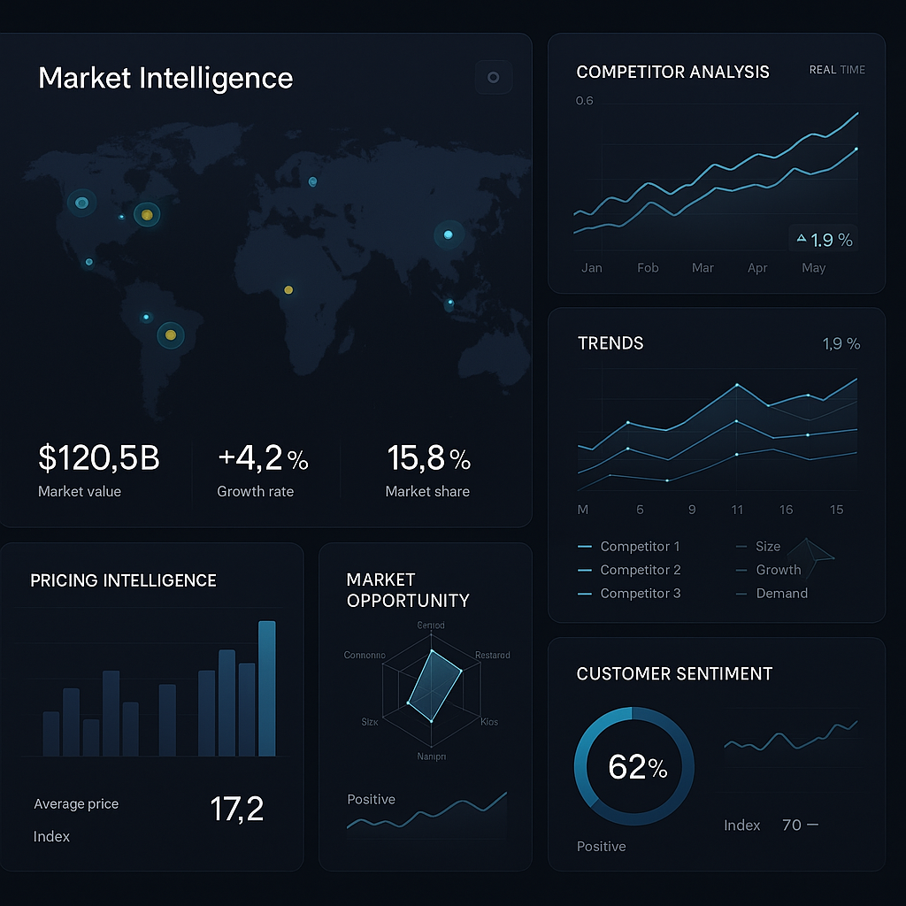 The Market Intelligence Engine is a sophisticated AI platform that transforms raw market data into actionable business intelligence. By continuously monitoring competitor activities, market trends, and customer sentiment, the platform provides real-time insights that enable strategic decision-making. Whether you're tracking competitive pricing, analyzing market opportunities, or forecasting industry trends, our AI-powered engine delivers comprehensive intelligence that keeps you ahead of the competition. The platform aggregates data from multiple sources, applies advanced analytics, and presents insights through intuitive dashboards and automated alerts.